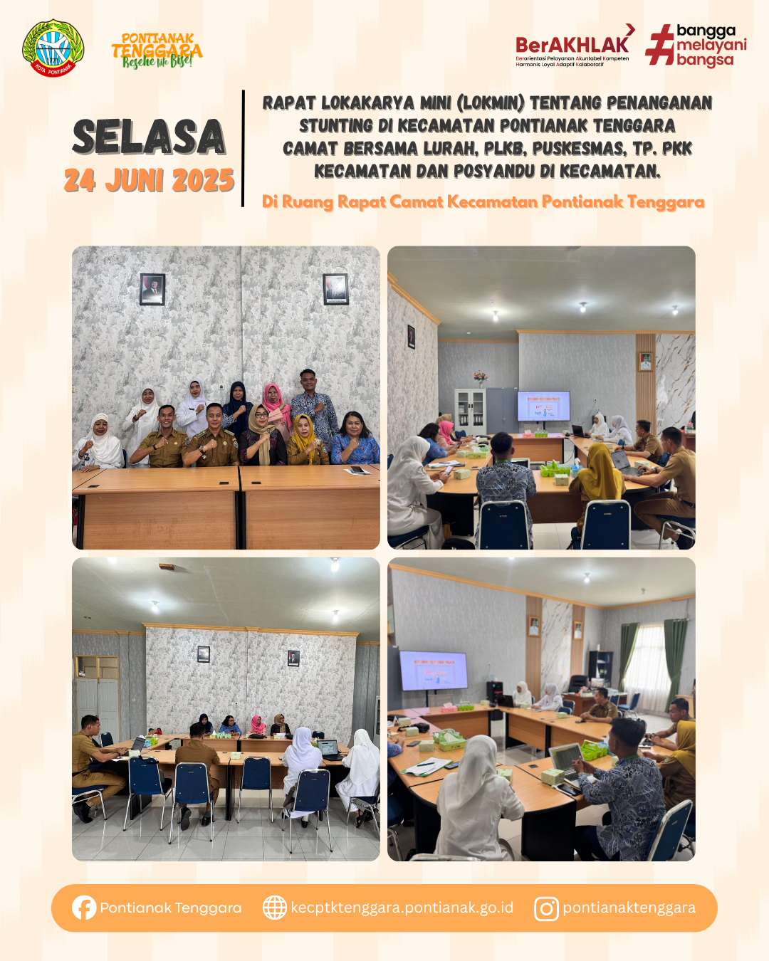 Selasa, 24 Juni 2025Rapat Lokakarya Mini Tentang Penanganan Stunting di kecamatan Pontianak Tenggara. Camat Bersama Lurah, PLKB, Puskesmas, TP PKK Kecamatan dan Posyandu di Kecamatan di Ruang Rapat Ca...